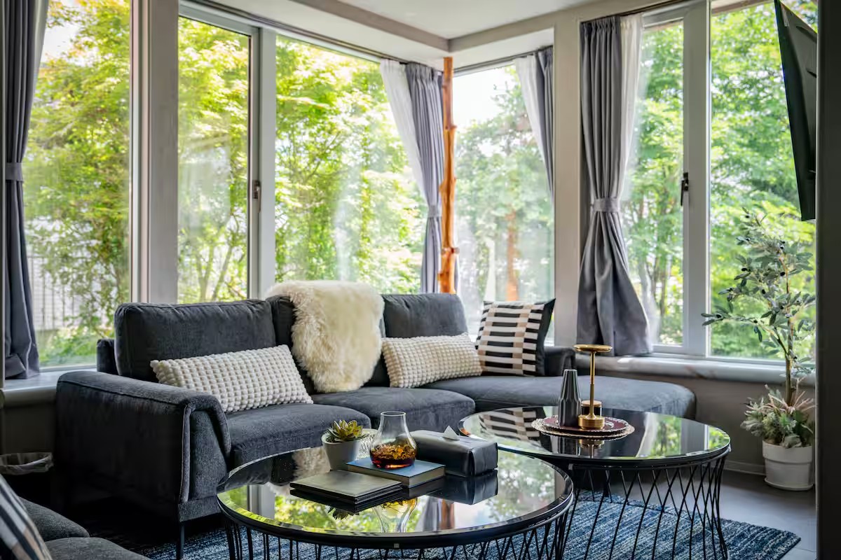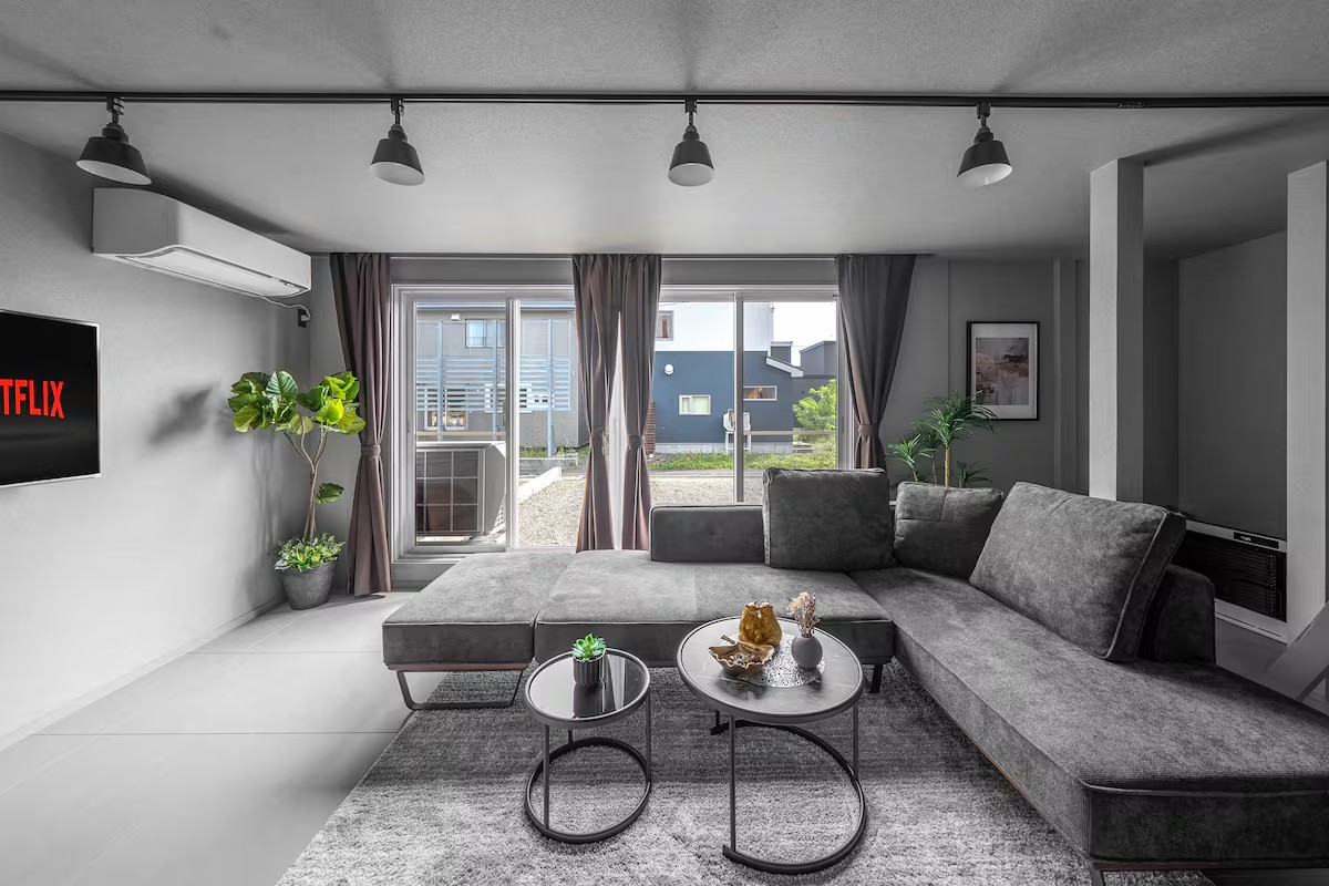 デザイン性の高いインテリアが配置された5LDK/136㎡の間取りには、大きな窓の開放的なリビングがあり、最大18名の宿泊が可能。ダブルベッド8個、クイーンベッドを1つ配置し、大家族での滞在も可能。富良野駅から徒歩7分とアクセスの利便性も抜群です。